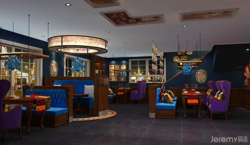 巴黎回忆酒吧位于鹭岛国际步行街,旨在打造高端浪漫具有法式风情的酒吧。装饰上利用浪漫的花式线条和巴黎特点的装饰物作为重点表现,同时加入酒吧的啤酒盖、红酒桶等元素,蓝色和紫色的配搭营造温暖,柔和的浪漫气氛。