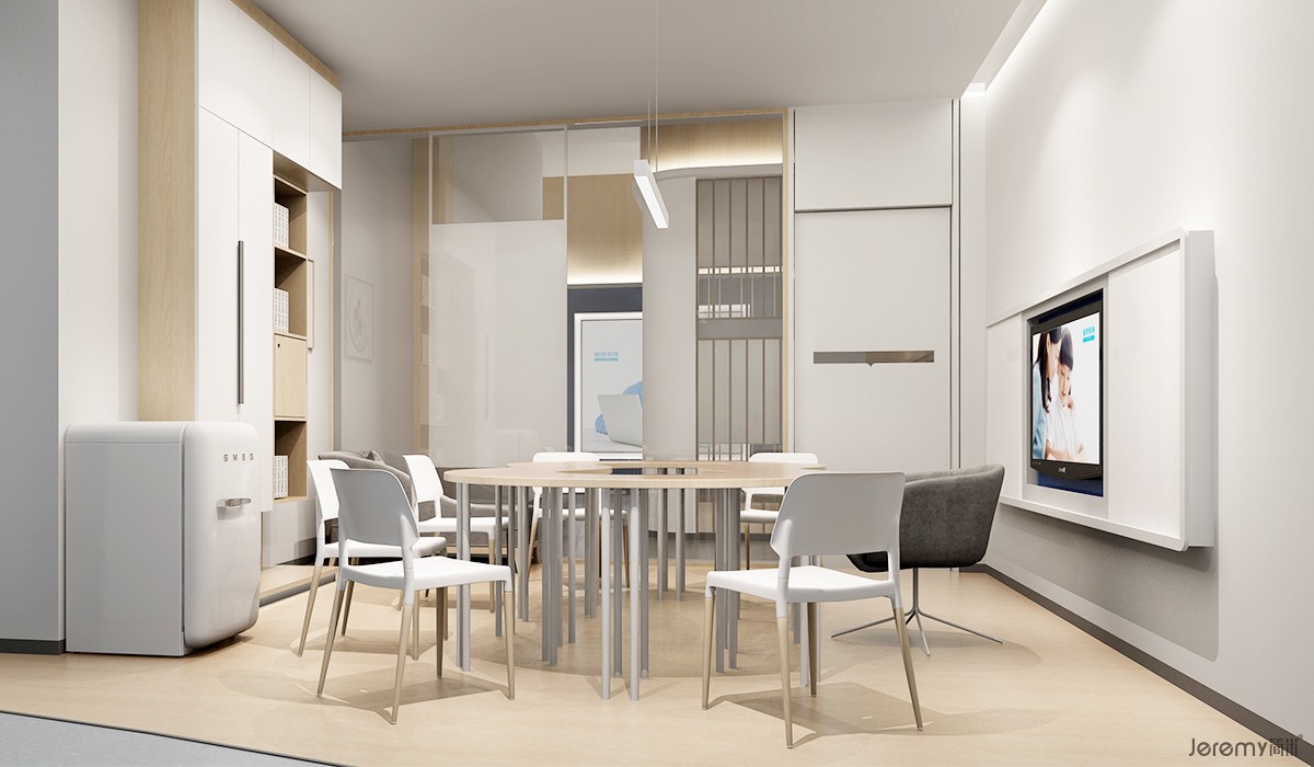 门头我们采用主色深海蓝,以书本展开的造型请君入内,未入而书香气自来!大厅以深海蓝搭配木纹饰面板,庄重而不冰冷。这里要说的是,在教室区域,我们设计是以教师为第一受众,教室是每一位老师的专属空间,在每间教室配有舒适的休息椅子,冰箱,衣橱等人性化设计。桌椅的设计也重点对人机工程进行深度的推敲。