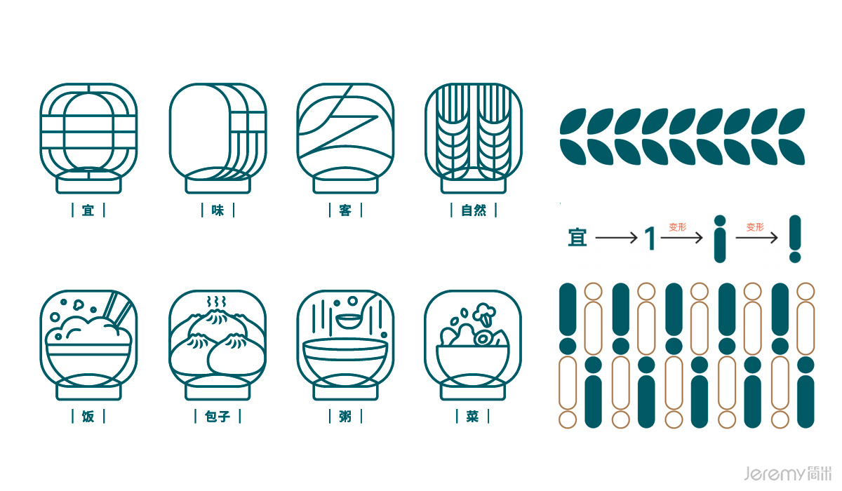 在核心识觉上我们对“宜味客”原字体进行了简化,去除了变化的小细节,使其更易识别、传播。而核心品类上原形象过于强调其代表品类“八宝粥”,让新客户会误以为其为“粥店”,而有其他餐饮需求的新客会望而却步。因此简米团队在继承其原有核心品类的基础上,让相关品类图标化,以凸显其连锁简餐的特性。