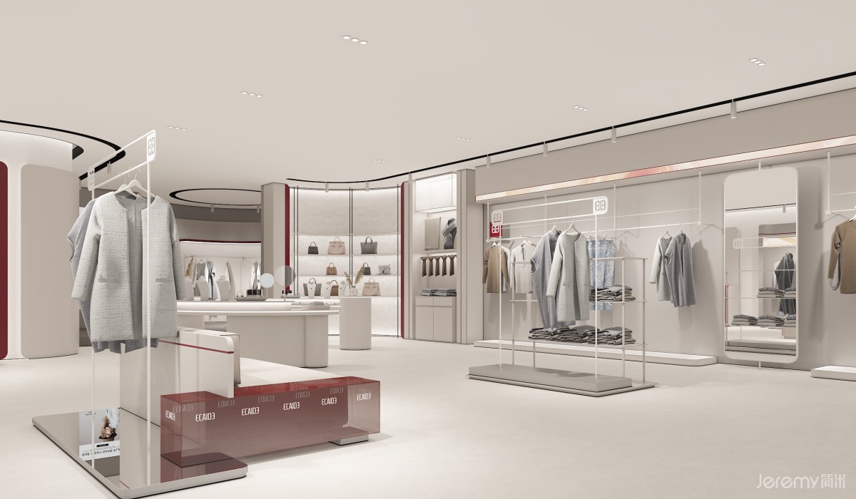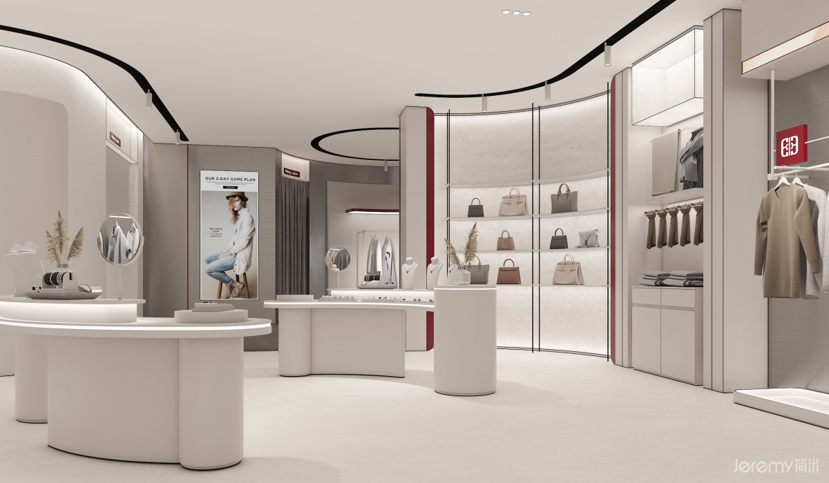内部空间划分为产品展示、服务、休闲与 VIP 三大模块:靠墙陈列台与中岛展示区最大化利用空间,让顾客多维度浏览产品;入口模特展示台直观呈现穿搭效果,引导人流动线;饰品陈列架与陈列柜丰富展示维度,延伸品牌风格表达。收银区高效便捷,试衣间保障私密体验,休息椅与 VIP 专属区域则升级舒适感与尊贵感,全方位契合中高端客群需求。