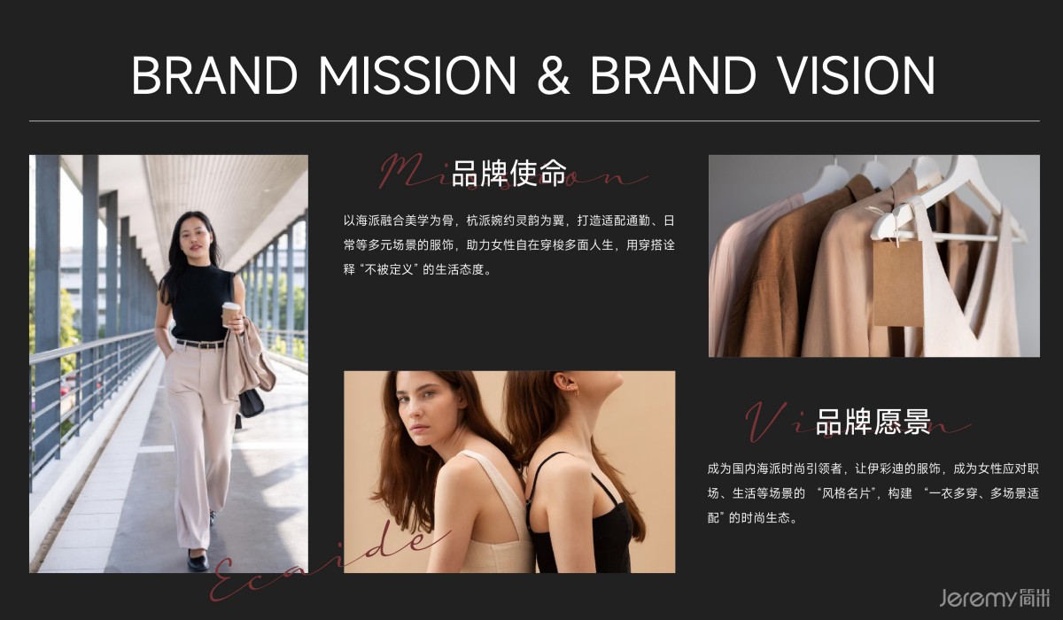 品牌视觉核心辅助形以双反向大写 "E" 构建对称闭环,灵感源自中国传统回纹、窗棂的平衡美学,既暗合杭派建筑的对称格调,又呼应海派空间的开放特质。几何形态中交织非遗工艺的匠心传承,碰撞中西文化的先锋表达,将杭派婉约与海派雅奢融于一体,精准传递 "穿起多面人生" 的品牌主张。