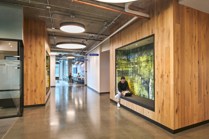 天然元素木质木板,发光的天窗般的灯光以及抽象的视觉图案和图像中。开放式办公室的特点是精致的质感,几何棉絮吸音天花板(灵感来自于地图网格)和鲜艳的色彩,以进一步强调动态景观。