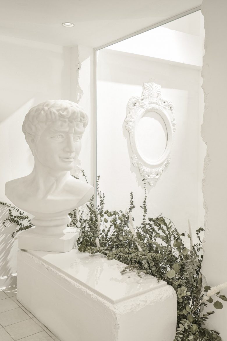 店铺设计以圣托里尼岛被选为主要风格,并运用希腊神话雕塑等,当代美学的最大灵感之一成为概念店的点缀