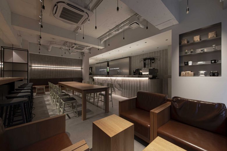 该店铺设计通过在砂浆、黑铁、橡木等基础材料上加入不锈钢、镜子、瓷砖,空间获得了更加优雅和轻松的氛围,使咖啡厅和酒吧的两个方面可以自然地连接起来。