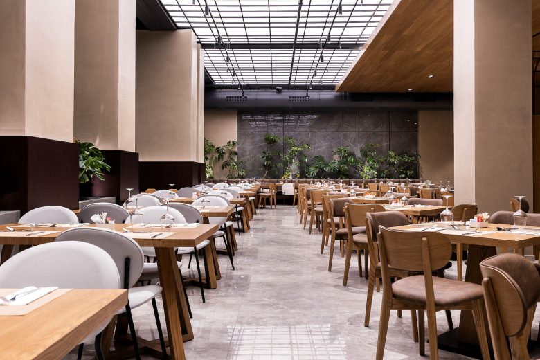 店铺设计项目位于希腊伊拉克利翁,是Artemis 餐厅的形象设计,在设计方面特别具有挑战性的是空间位于地下,因此在设计过程中主要关注的问题之一是最大限度地利用自然光。这是通过在东侧创建一个大型中庭来实现的,其中还包括一个水元素,以及一个较小的中庭,在接待区有树木。然而,在天花板上建造的光墙和人造天窗不仅照亮了空间,还创造了餐厅里额外自然光的错觉。这种感觉与种植天然植物(减少自然光需求)的花盆相得益彰,为空间增添了自然气息。