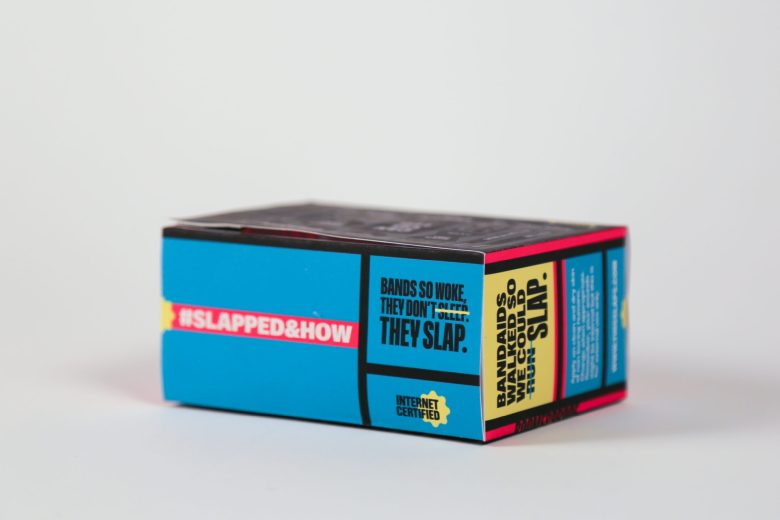 该设计是印刷,大胆和鲁莽,模仿绷带的结构和概念的古怪性质。这个Slaps就是要把绷带变成能引起Z世代共鸣的收藏品。大胆思考,面对面思考吸引你注意力的字体和颜色。这不仅仅是设计;这是一种态度,一种声明。