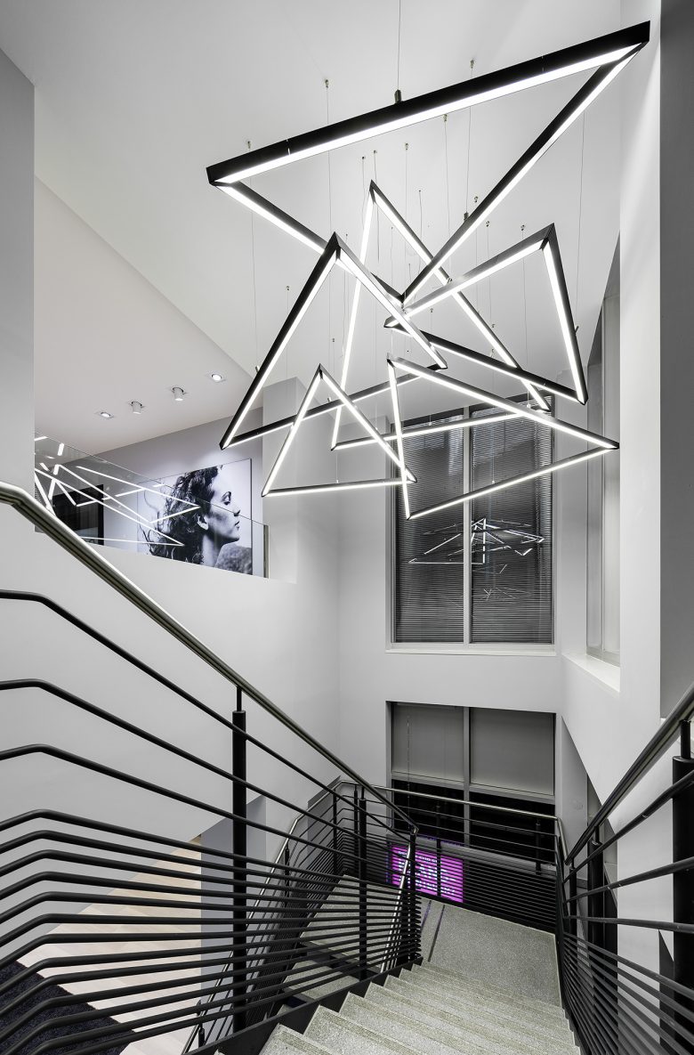 该店铺设计了一个等候区和一个儿童游戏角被整合在一起,以避免交叉路口。与以前不同的是,一楼的听证会工作室被放在前台。在这里,一位声学专家的作品被公开呈现。得益于隔音玻璃,一个安静的休息区仍然得到了保证,除了正面外观外,销售区的客户也可以使用。为了在咨询区营造额外的氛围,使用了带开放式黑色天花板的吊顶帆和周围的电力轨道作为基本照明。光线分布营造出柔和柔和的光线感觉,让客户感到放心。上层有一个抽象的灯光雕塑的开口既是一个引人注目的地方,也是一个建筑焦点,使两层楼融为一体。