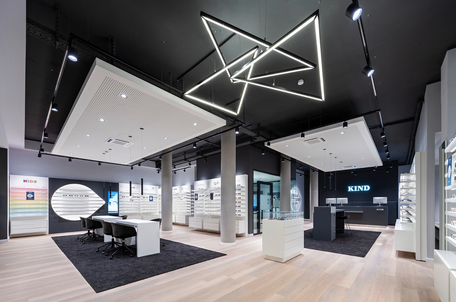 这家眼镜店设计的位于纽伦堡的黄金地段,面积超过300平方米,其现代、棱角分明的形状设计与部分圆形、有机的形状相结合,吸引了新的消费群体。产品陈列放在前面,客户应该很容易找到。