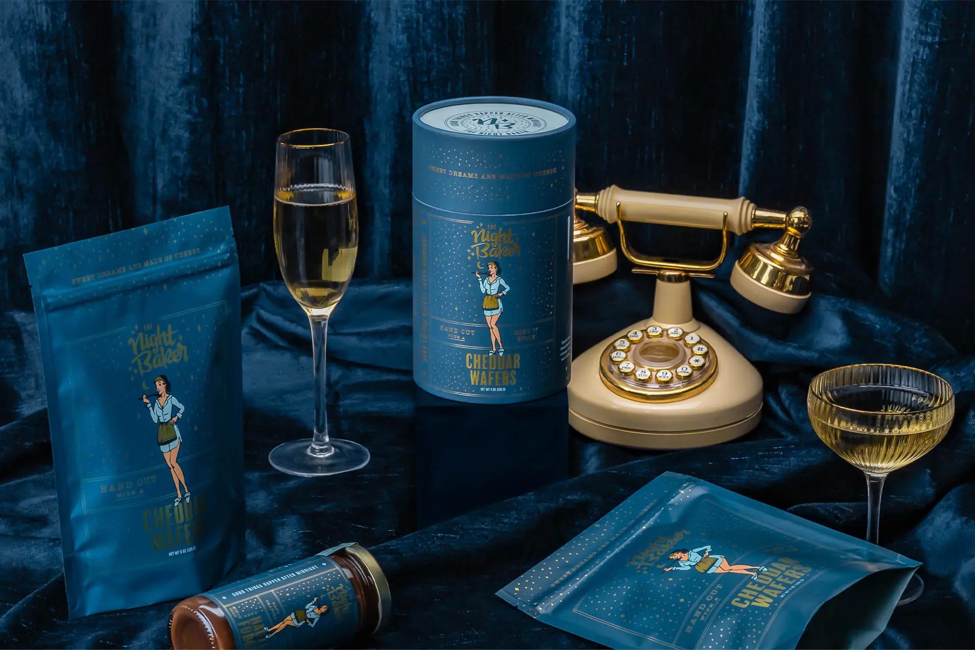 该VI设计项目是美国鸡尾酒品牌The Night Baker的平面设计,海军蓝色调和闪闪发光的金色调,零食包装设计给人高级感和礼品感。